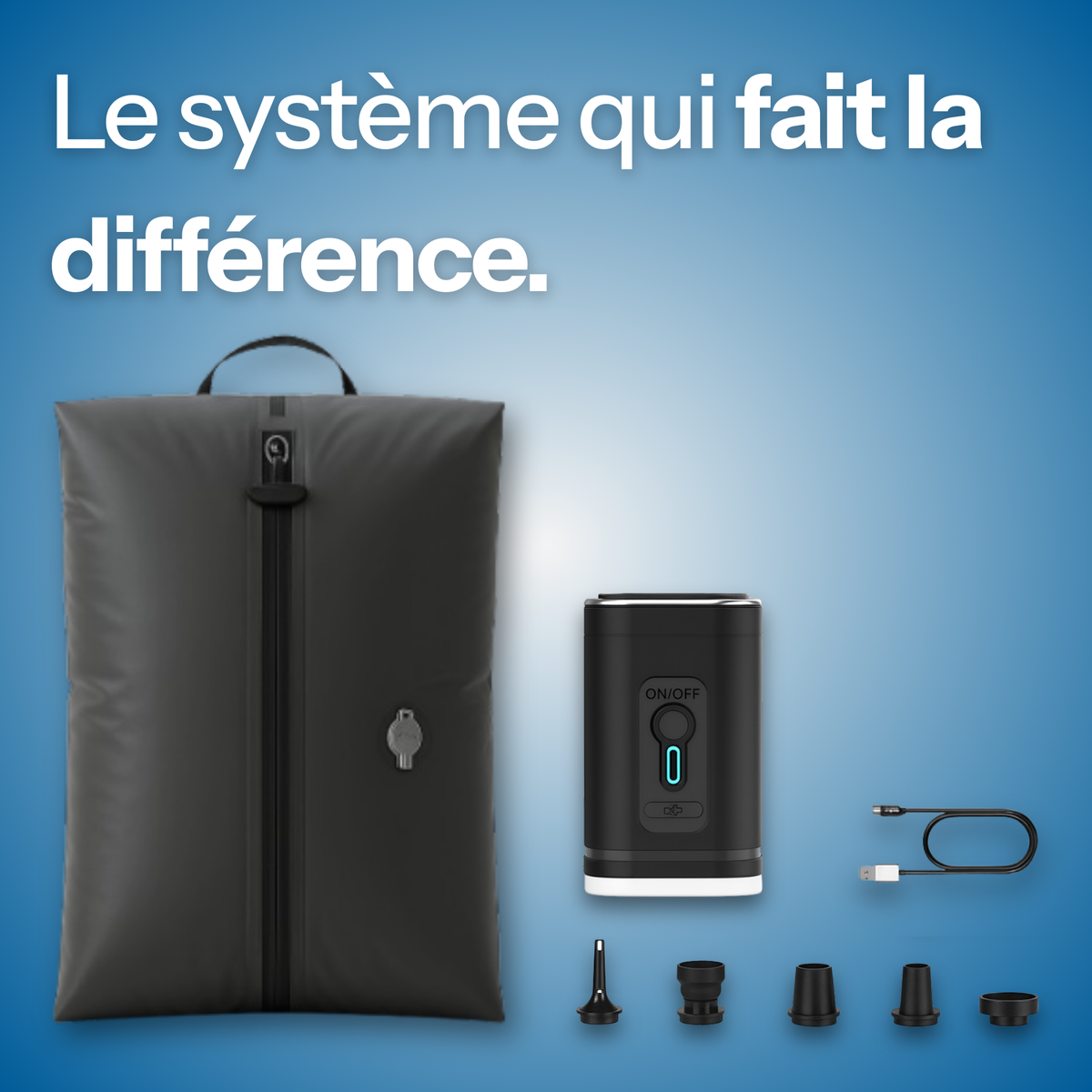 La pompe permet d’aspirer l’air pour compresser les vêtements, mais aussi de souffler pour gonfler si nécessaire.