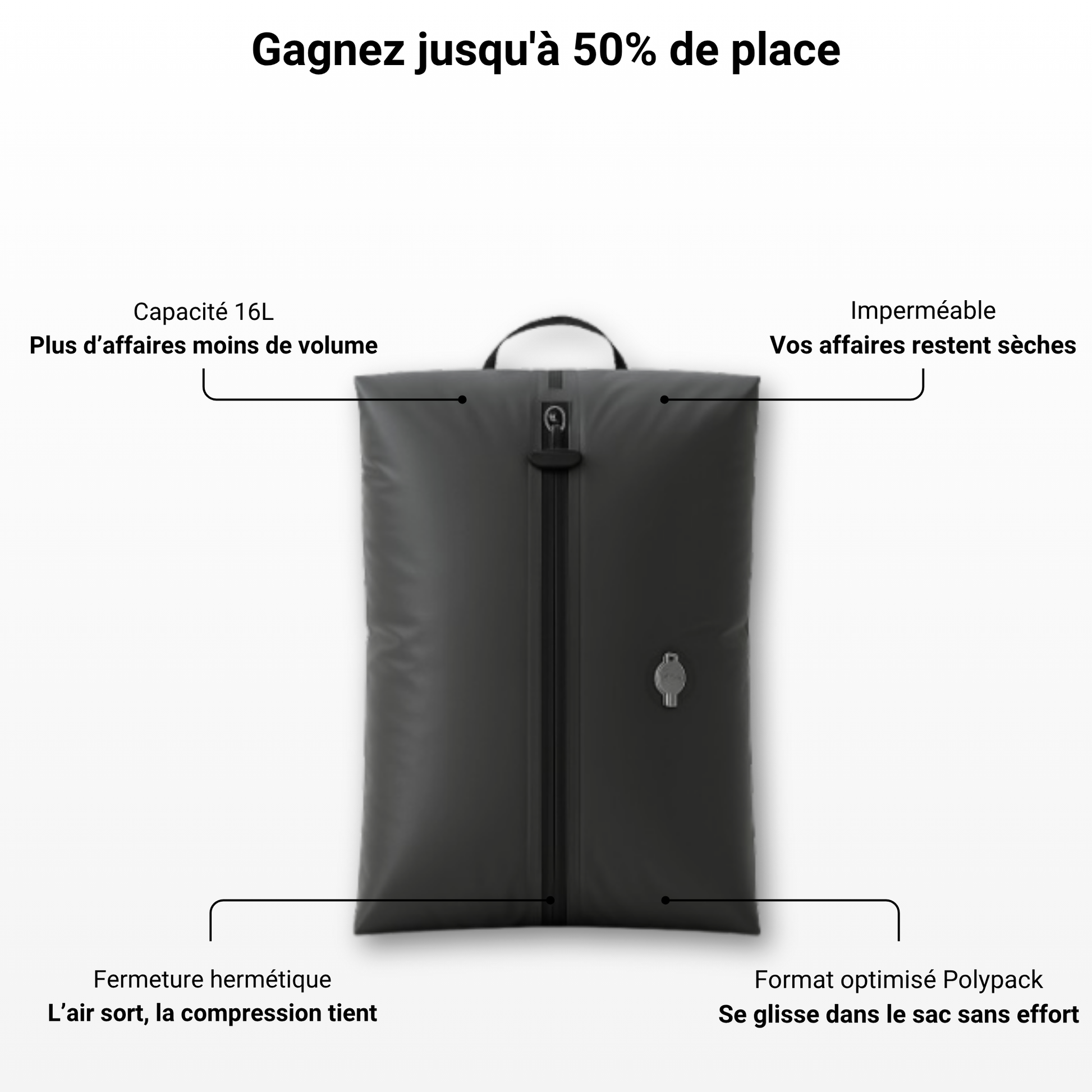 Le sac de compression sous vide Sacadow est conçu pour celles et ceux qui veulent voyager léger… sans jamais se limiter. Grâce à son système d’évacuation d’air ingénieux, il réduit instantanément le volume de vos vêtements pour libérer un maximum d’espace dans votre Sacadow Polypack ou dans n’importe quel bagage.